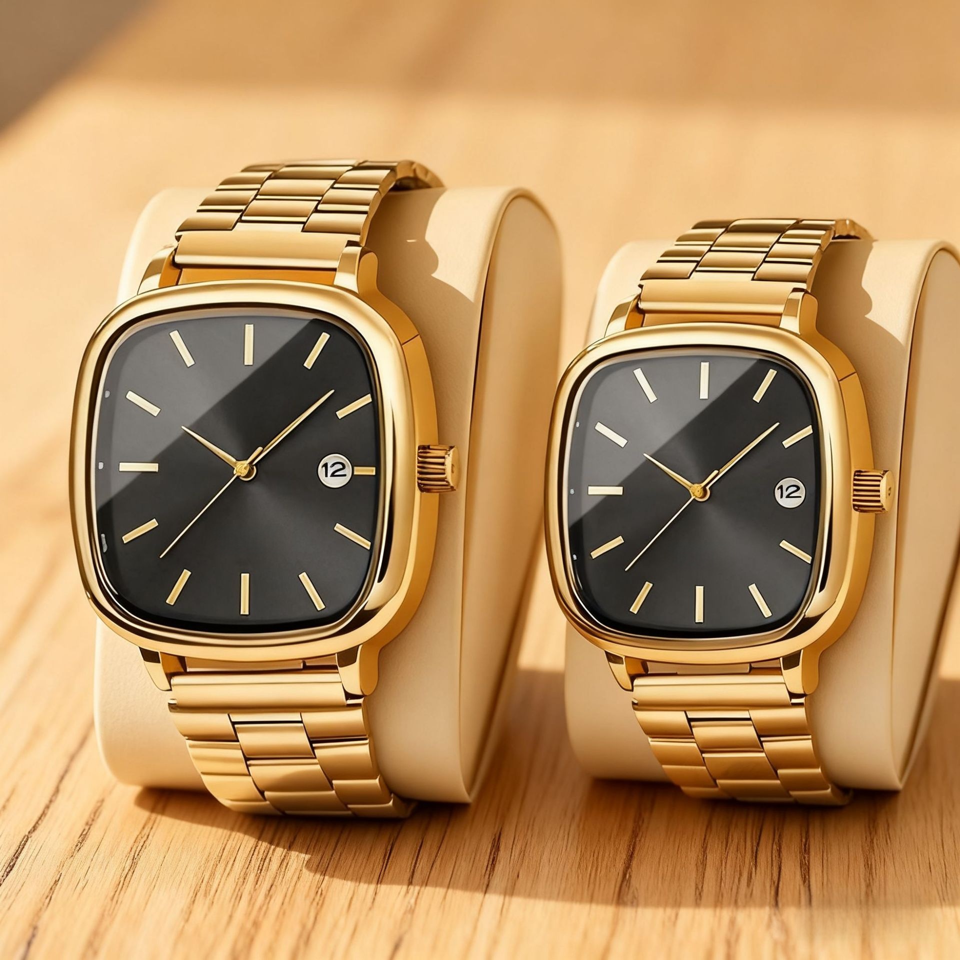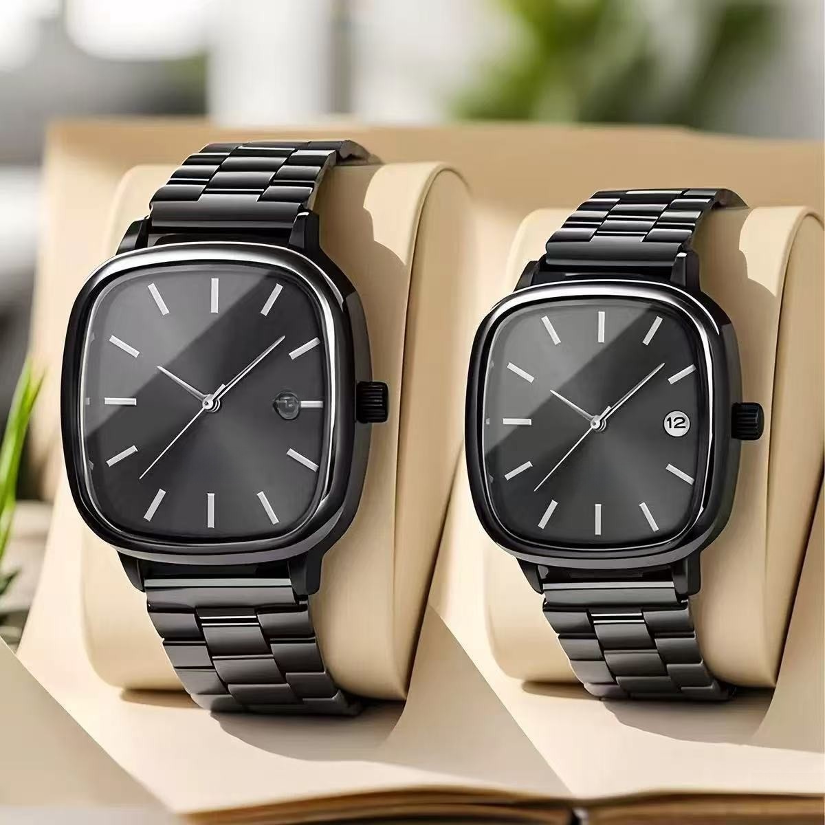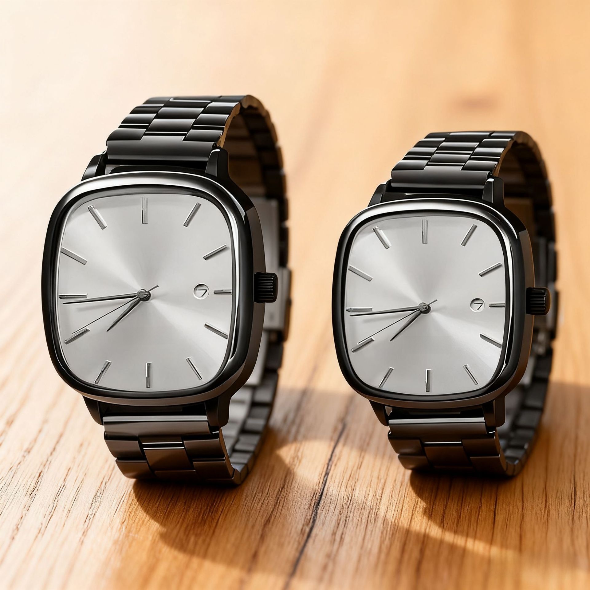 Square Dial Design: Retro-inspired square face with pointer display and small three-hand style.
